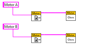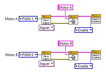 The sample code shown in the block diagram below would typically be placed in the Periodic Tasks.vi of your LabVIEW project. This example enables us to independently control two motors A and B connected to PWM channels 3 and 4 in the Begin.vi. For Motor A we can use joystick buttons 3 and 5 to drive the motor in either direction. For Motor B we can use the LabVIEW "Accelerate" and "Decelerate" switches on the front panel of the Periodic Tasks.vi to modify the motor speed.